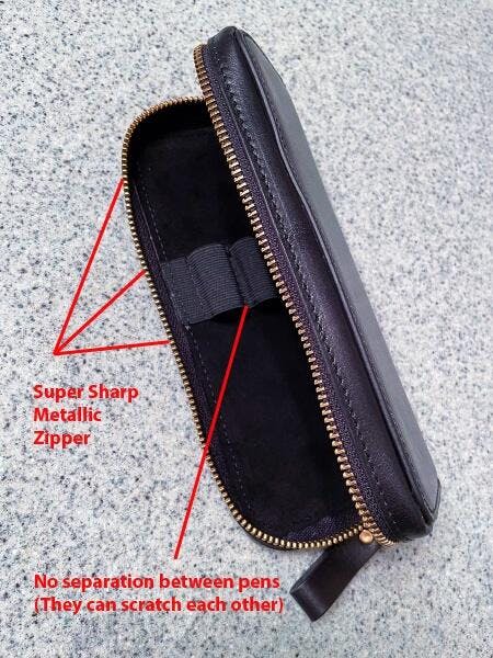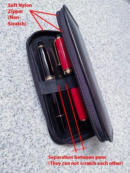 These are the best two-pen cases in the market, that is, if you get the correct product shipped to you. I already own a couple of these cases, one in black and another in brown and they are absolutely perfect for protecting my pens. I recently ordered a third one but what I received via FedEx really rattled me. Instead of a case with the gentle nylon zipper and plenty of separation between the two pen holders, I got a narrow case with a large metallic zipper as spiky and sharp as a chain saw. I ordered the case for a recent acquisition of a Montblanc Legends of the Zodiacs - Horse 521 Limited Edition 521 and for an S.T. Dupont Phoenix special edition. but those pens will certainly not going to go into the case that I received. Customer Service is working to get the correct product sent to me but it hasn't happened yet.